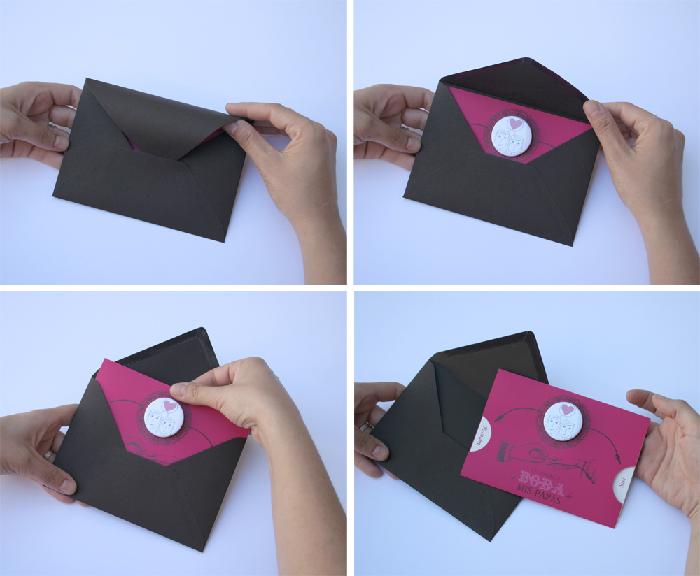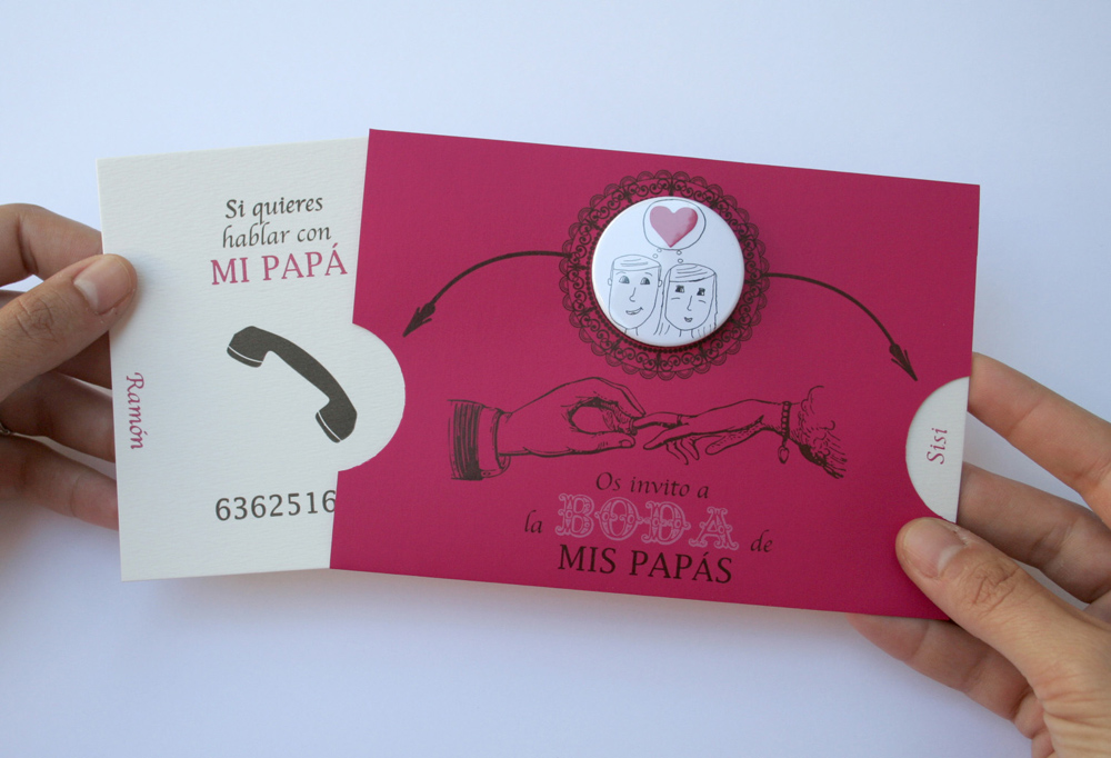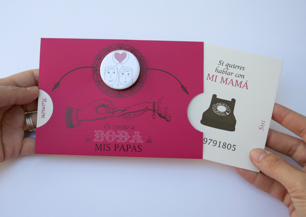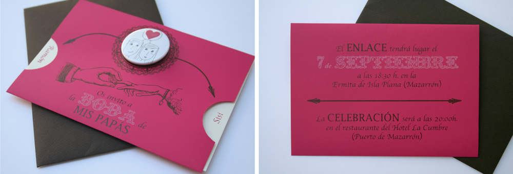 Lucía ha tenido la suerte de poder ver cómo sus padres se han casado, y este hecho ha sido el motor que nos ha ayudado a idear esta invitación. A partir de un dibujo que ella misma ha creado, se hicieron unas chapas que funcionan como elemento principal de la invitación y que además han servido como recuerdo para todos los invitados.